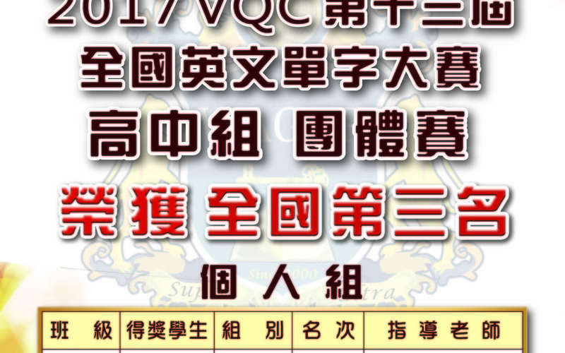 賀! 2017 VQC第十三屆全國英文單字大賽 榮獲 高中組團體賽榮獲全國第三名! 個人組 班級 得獎學生 組別 名次 指導老師 觀三甲 呂九恩 高職組 第四名 鄭淑文、顏仙媛 普一丙 吳芳郡 高中組 優勝 陳諭璇、謝侑芸 國二甲 翁世勳 國中組 優勝 劉俞辰、姜品如 外語部暨英文科 敬賀