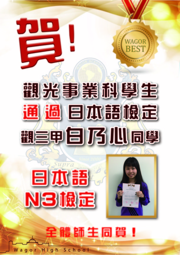 賀!觀三甲白乃心同學通過日本語N3檢定