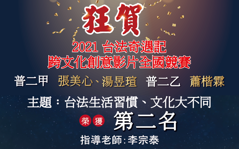 參加文藻大學辦理 「2021 台法奇遇記 跨文化創意影片全國競賽」榮獲第二名