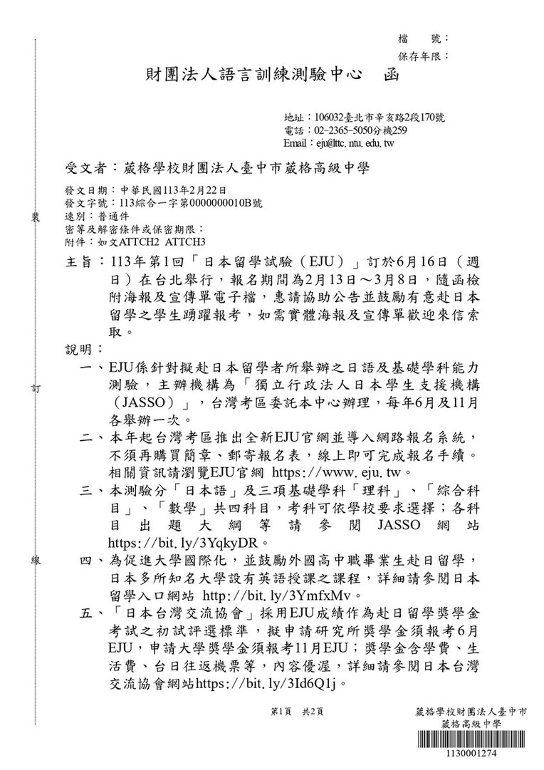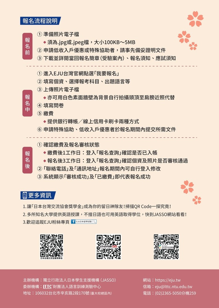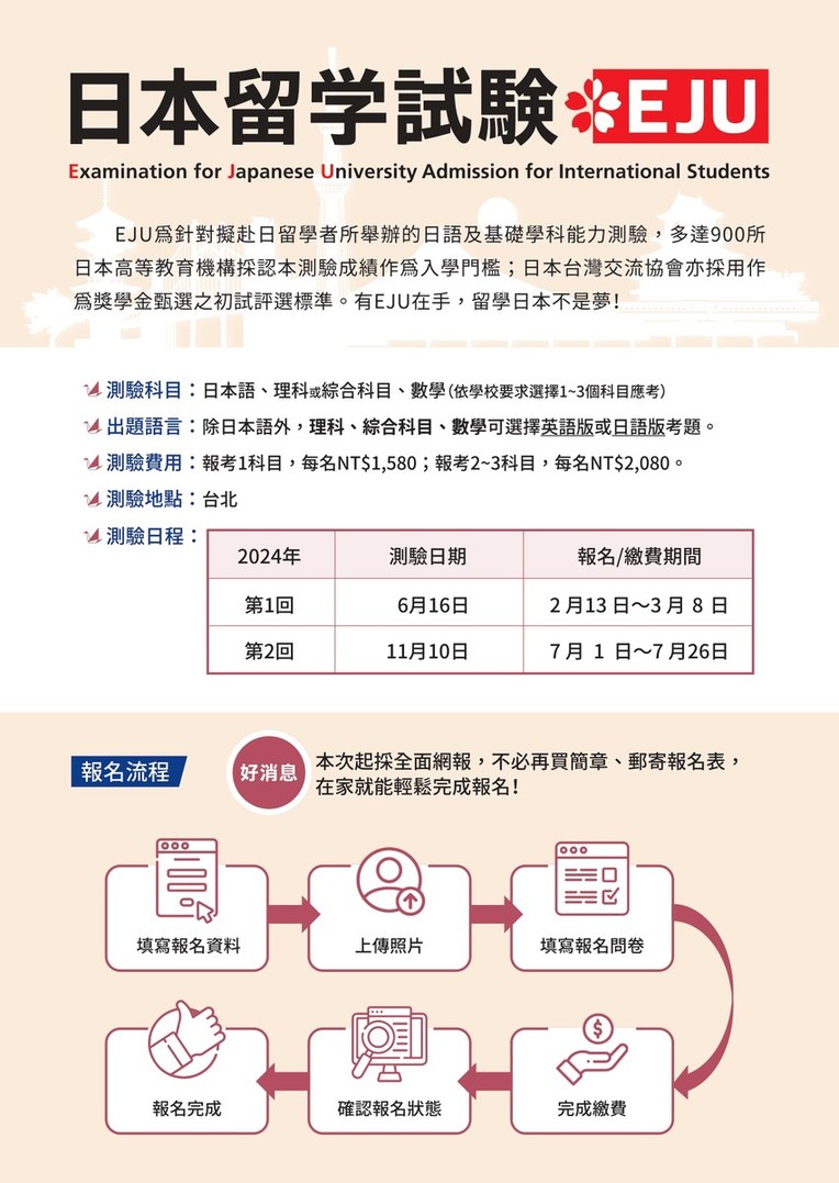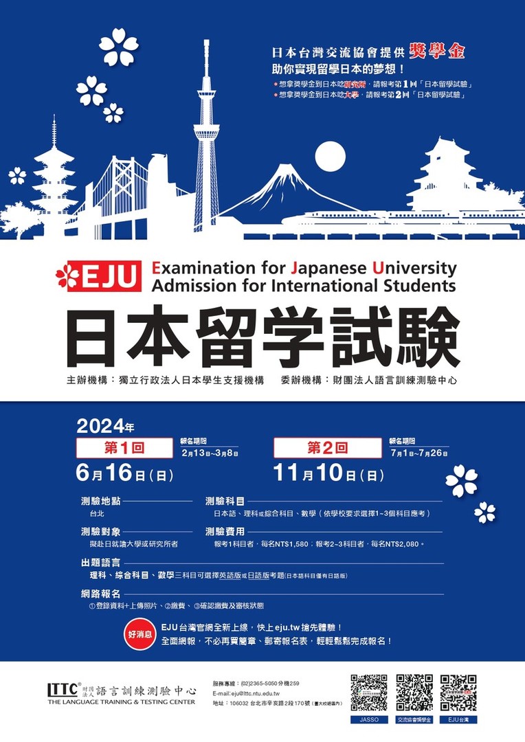主旨:113年第1回「日本留學試驗(EJU)」訂於6月16日(週日)在台北舉行,報名期間為2月13日~3月8日,隨函檢附海報及宣傳單電子檔,惠請協助公告並鼓勵有意赴日本留學之學生踴躍報考,如需實體海報及宣傳單歡迎來信索取。