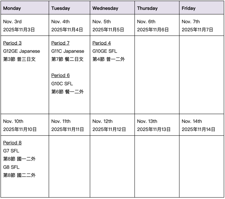 親愛的同學及家長們好, 於 2025/11/03-11/10 將進行 114 學年度第一學期 期中第二外語學習表現評量,考程表請參閱下圖。 授課老師將於課堂時宣導給同學,若該日無法到請於「三天前」先向授課老師請假。 缺考名單將於 2025/11/11(二)午休安排時間補考,若未到將以0分計算。 考試範圍請參閱附件。 附件 announce-46602.pdf