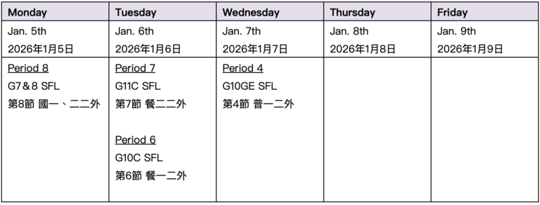 親愛的同學及家長們好, 114學年度第一學期 期末第二外語課程學習表現評量 1. 將於2026/01/05-01/09進行,考程表請參閱下圖。 2. 授課老師將於課堂時宣導給同學,若該日無法到請於「三天前」先向授課老師請假。 3. 缺考名單將於 2026/01/12 (一) 午休安排時間補考,若未到將以 0 分計算。 4. 考試範圍請參閱附件。 附件 announce-47321.pdf