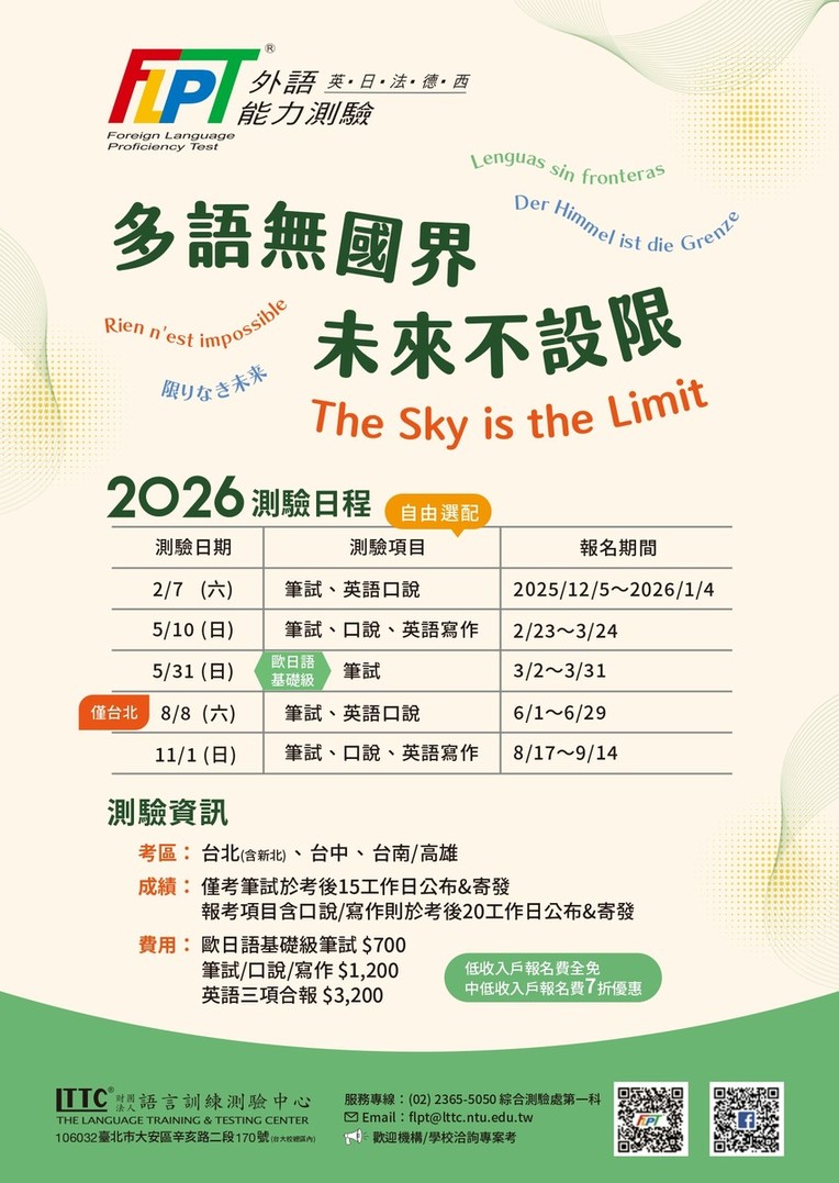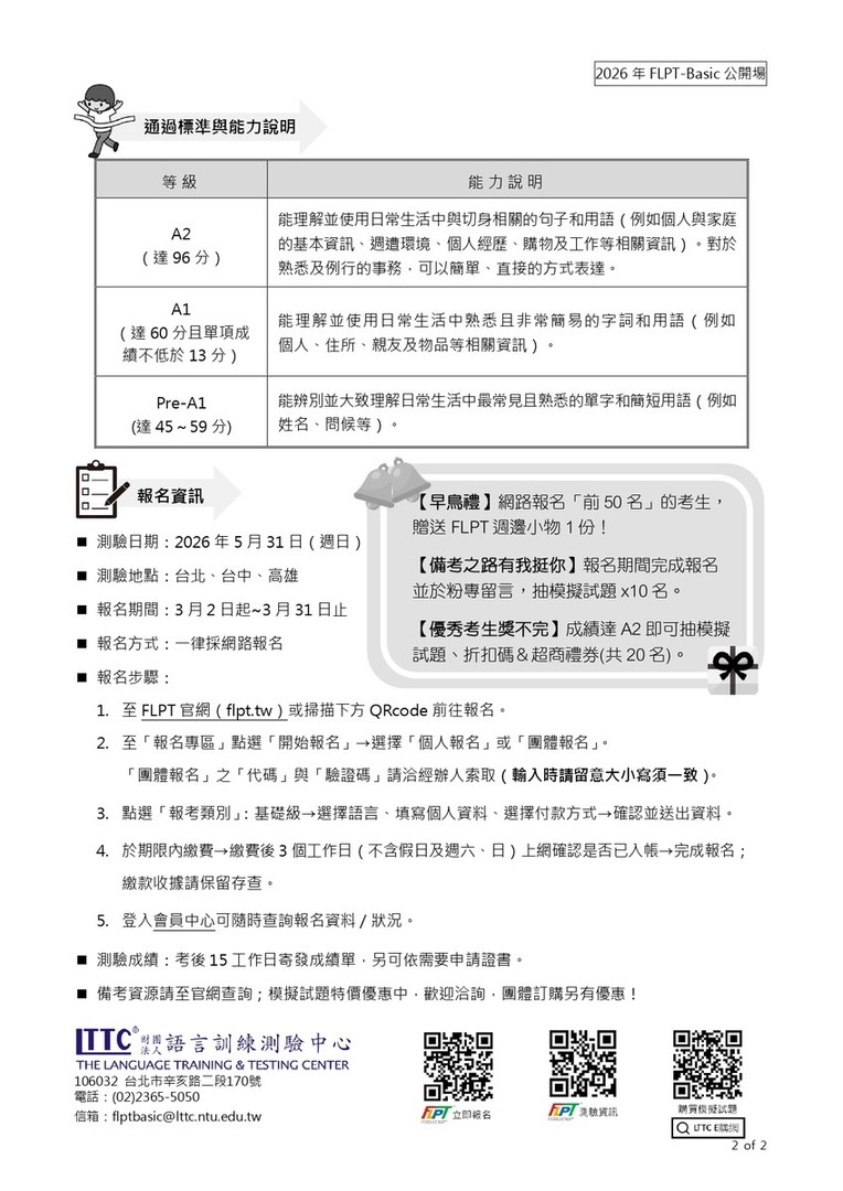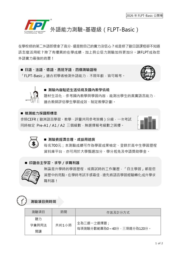 一、FLPT與FLPT-Basic皆採網路報名,測驗資訊如下: