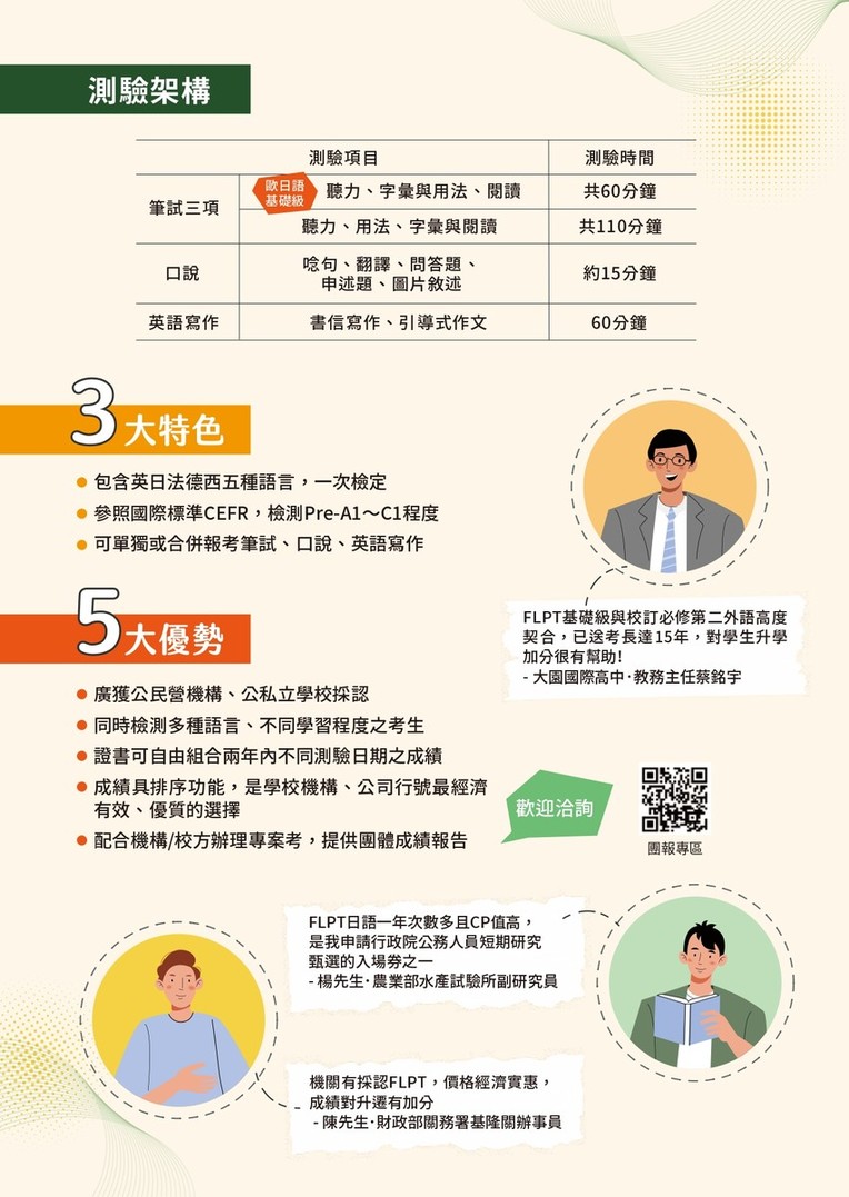4、測驗語言與項目:英、日、法、德、西班牙語|筆試(聽讀)、口說、英語寫作,可依需求單獨或合併選配報考項目