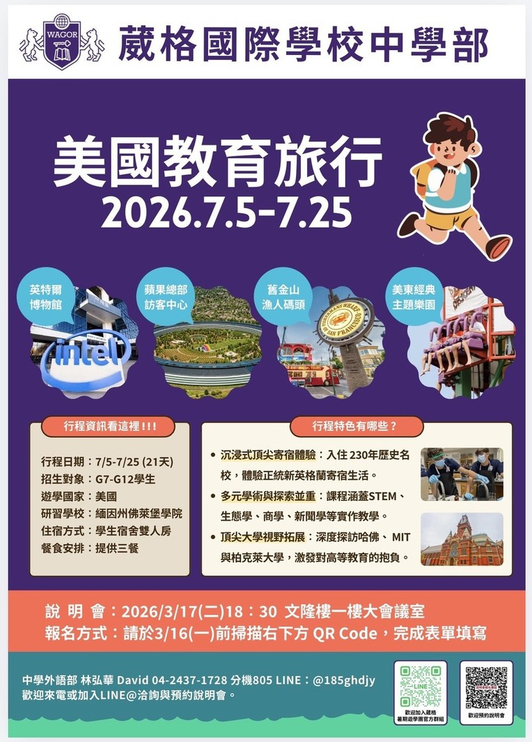 葳格國際學校將於以下時間舉辦暑期遊學團說明會!