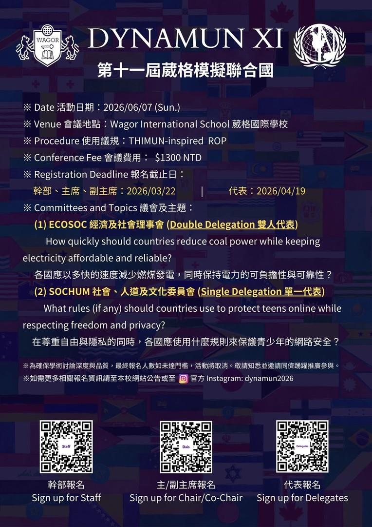若你有興趣擔任2026葳格模擬聯合國幹部,請填寫以下表單(請盡量以英文回答以下問題)。