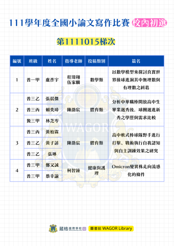 全國小論文寫作「第1111015梯次」校內初選公告結果如圖,請入選學生於