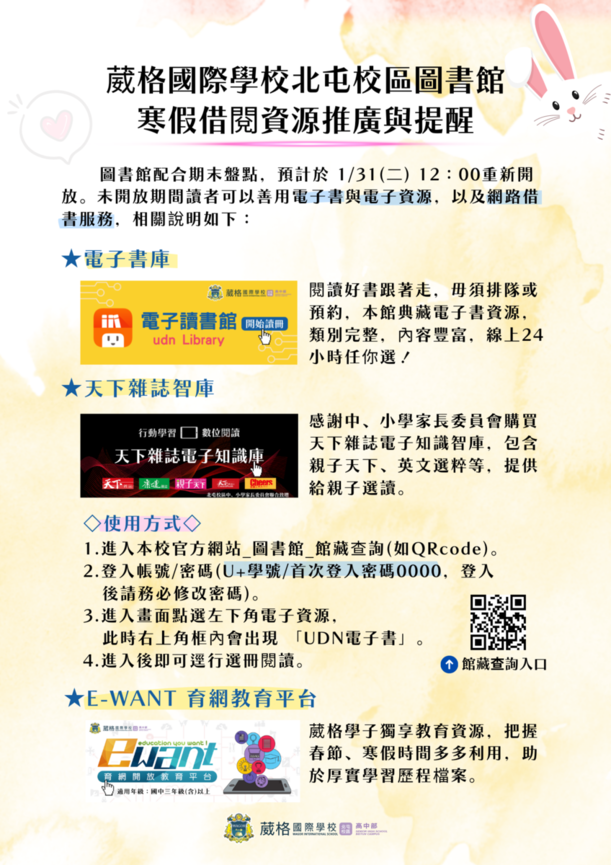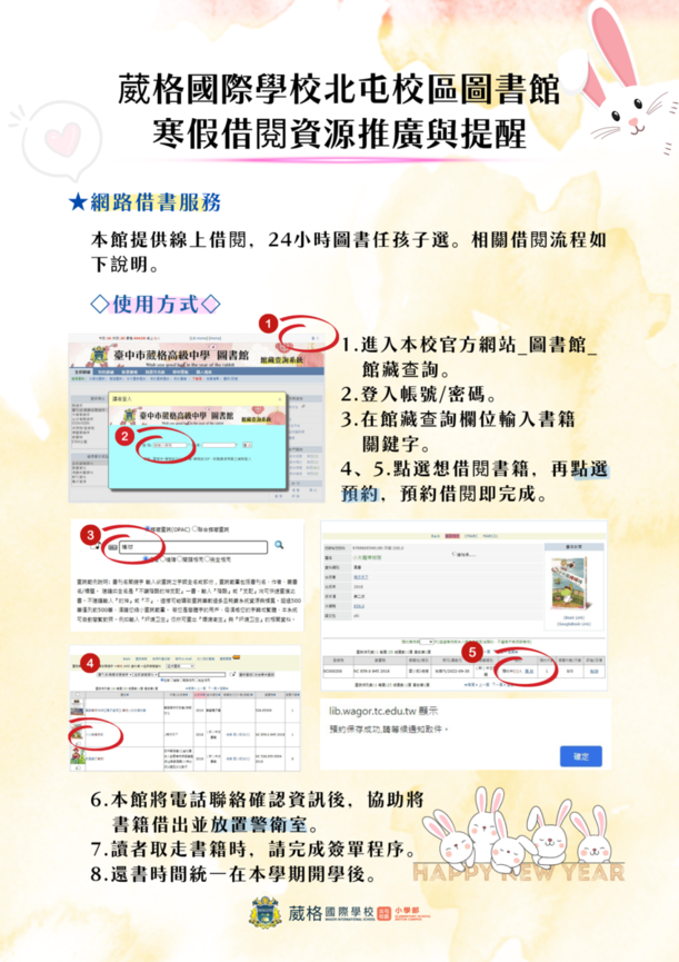 圖書館配合期末盤點,預計休館至 1/31(二) 12:00 重新開放。寒假期間可以利用 本館館藏查詢系統「閱讀電子書」,或「線上借閱書籍」,遨遊書海,強化「臺中市線上閱讀認證」,讓寒假更充滿知性與內涵。相關說明如圖說明。