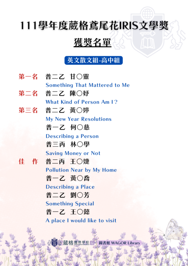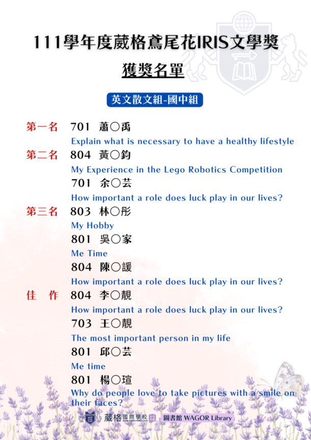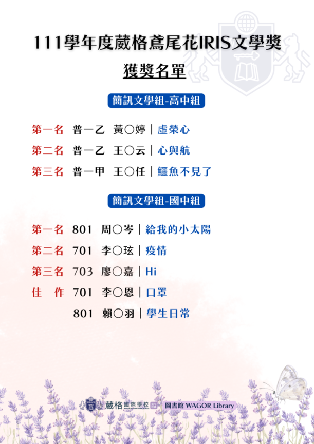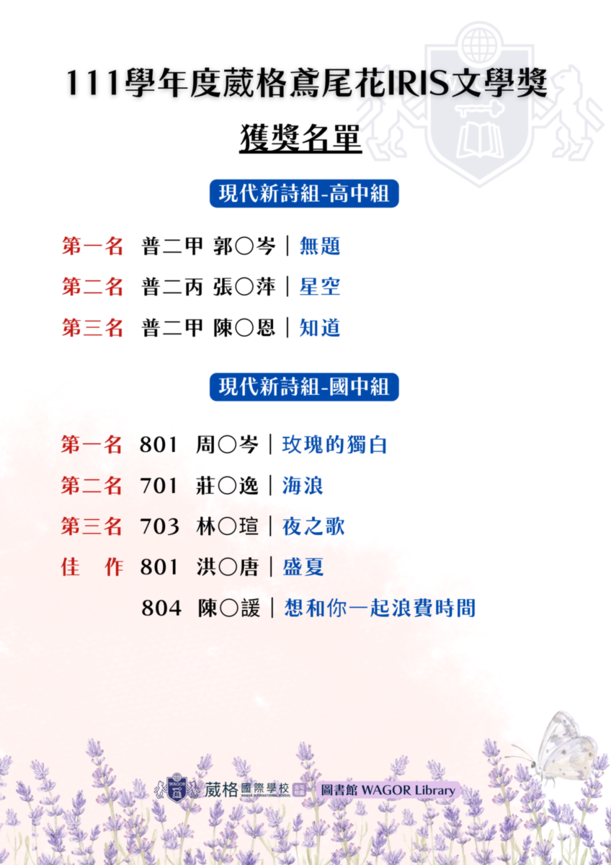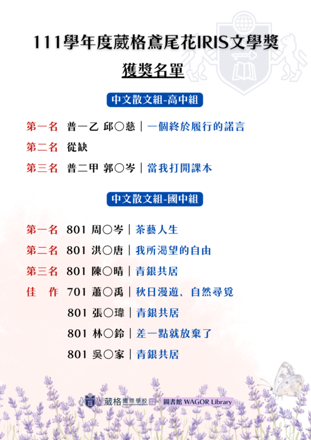 111學年度葳格鳶尾花文學獎評選結果公告如圖,相關作品資料如 學生作品專區-鳶尾花文學獎。為鼓勵積極投稿的學生,本次入選的作品將納入本館館藏,若有問題,請洽圖書館,校內分機770。