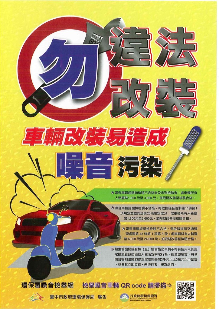 一、鑒於本局多次接獲陳情於校園周圍,常有車輛違法改裝行駛致噪音問題,為宣導校內師生勿違法改裝車輛,造成噪音污染,影響生活環境品質,旨揭單張敬請貴校協助列印張貼與宣導周知,以維護環境安寧。
