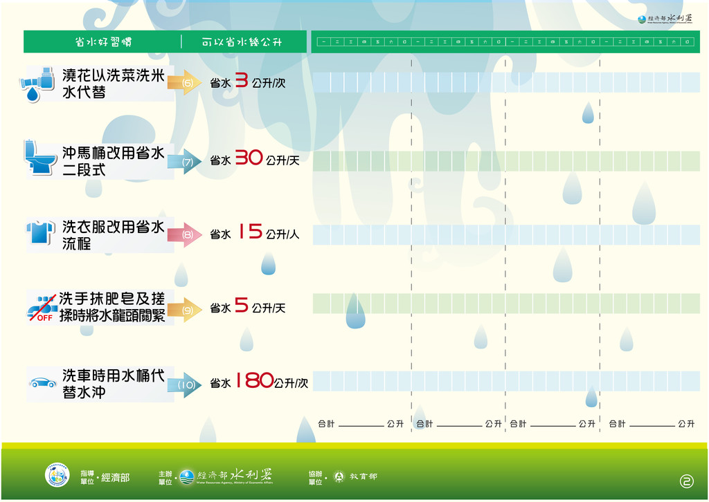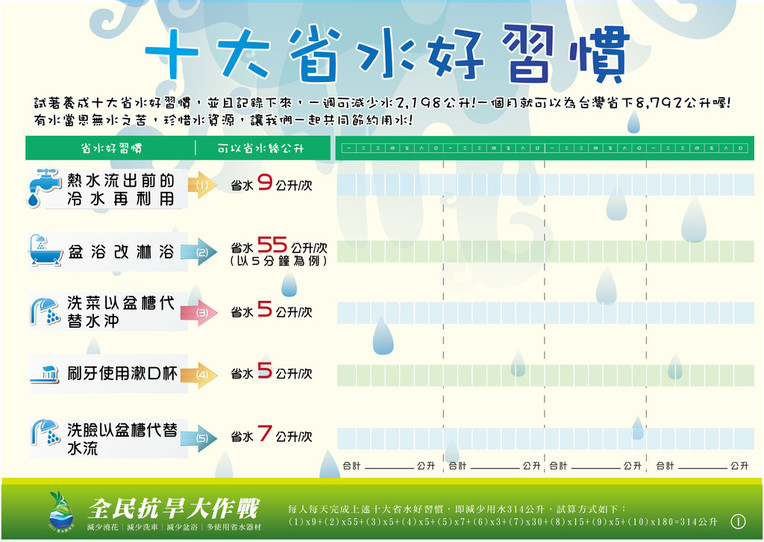 三、經濟部水利署提供小學生「十大省水好習慣」電子檔案(如附件),請學校自行運用,並共同合作推動教育宣導,以落實家庭節水工作。