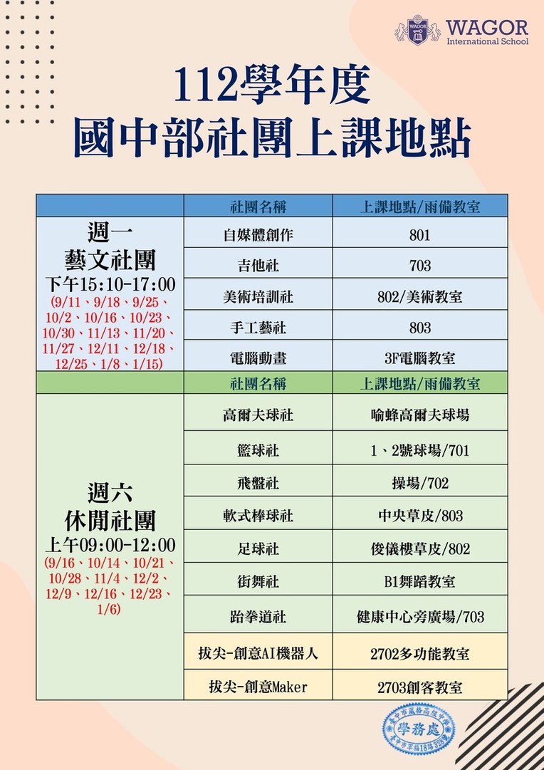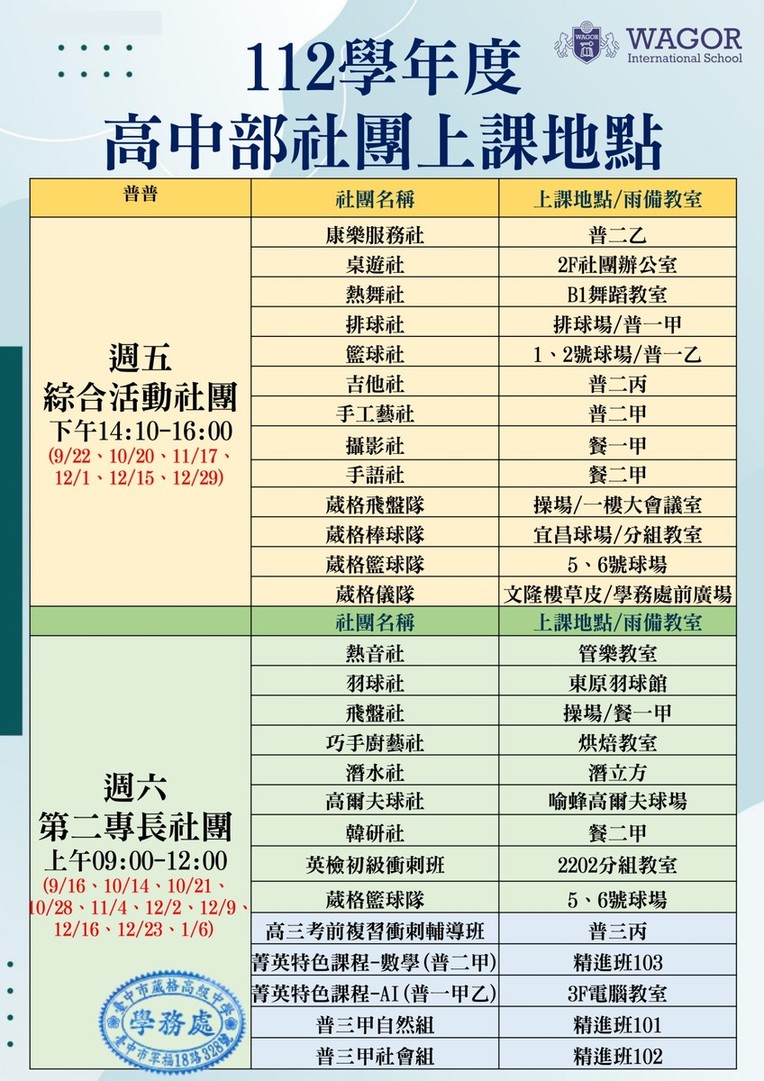 112學年度國高中各社團課程教室配置圖,請於課程期間備妥相關用具至指定地點進行課程。
