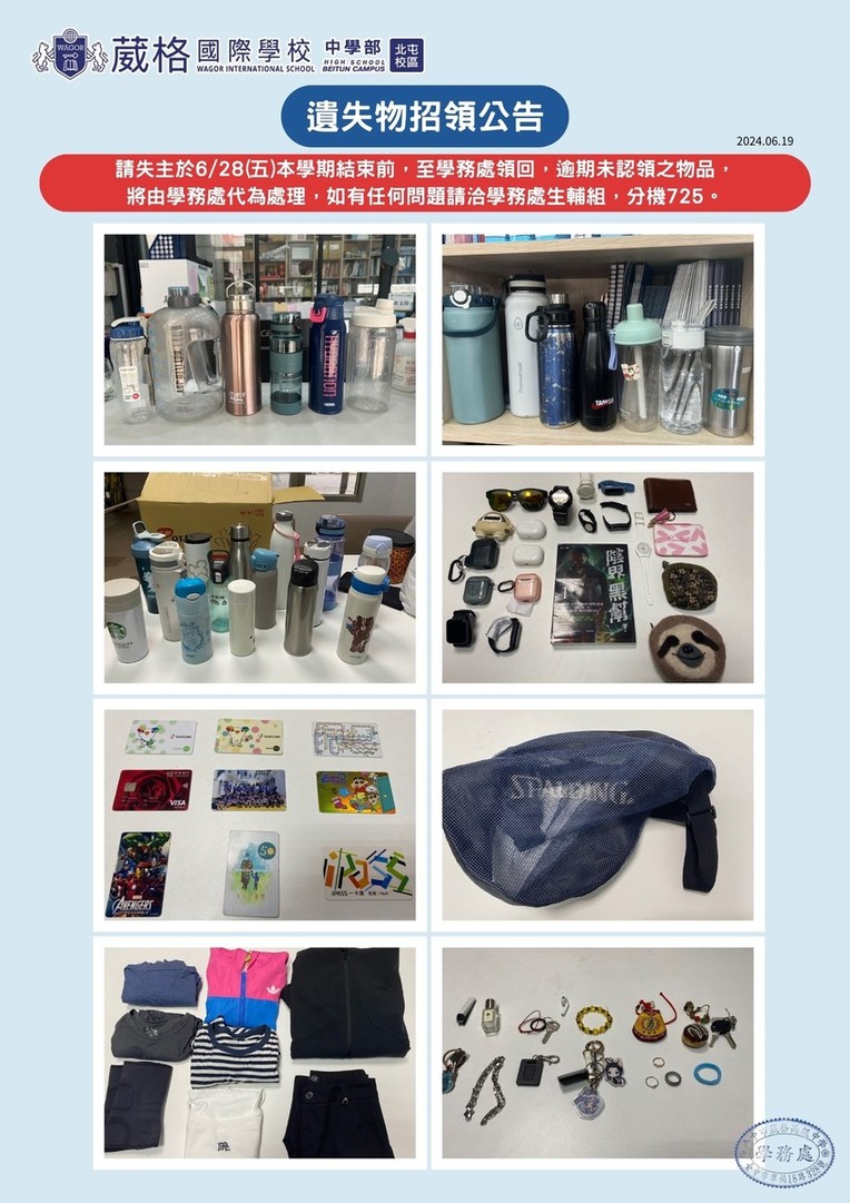 附圖內容為本學期拾獲的遺失物,請失主於6/28(五)學期結束前,至學務處領回,逾期未認領之物品,將由學務處代為處理,如有任何問題請洽學務處生輔組,分機725。