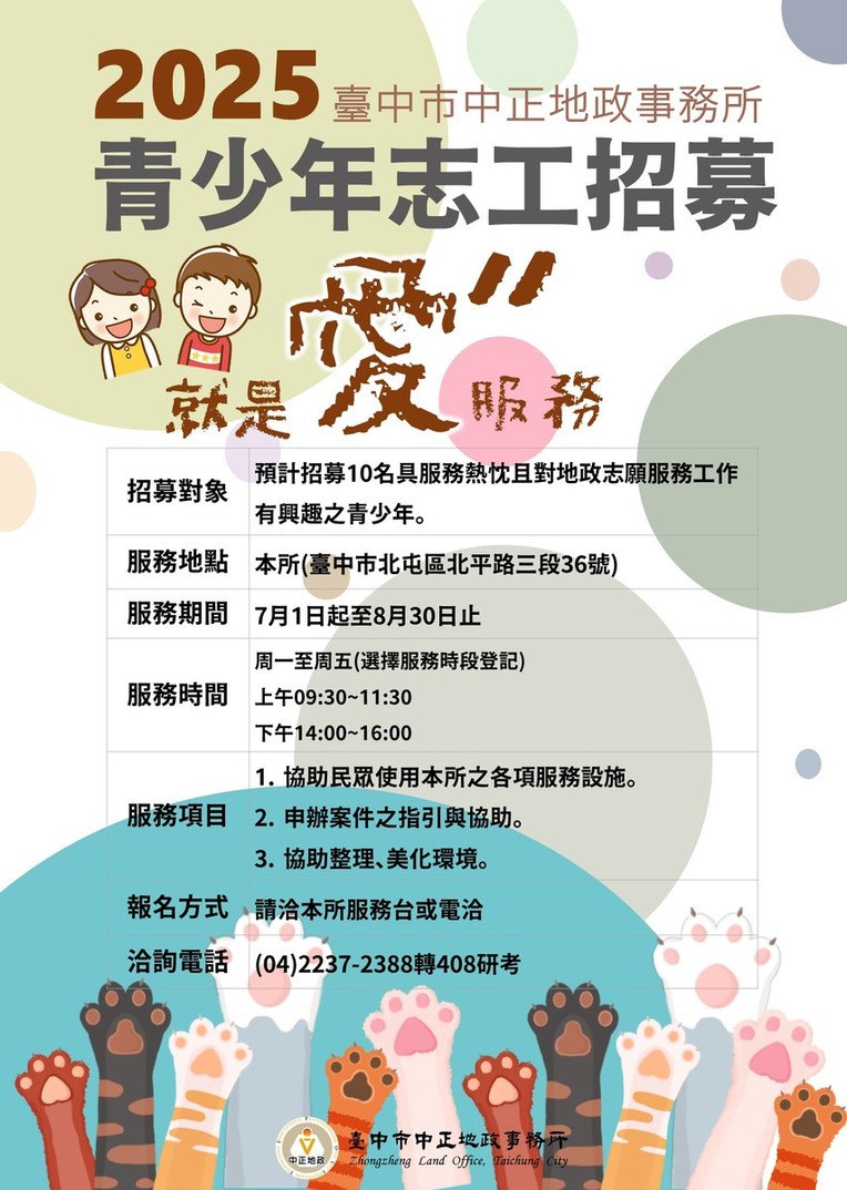 主旨:檢送本所114年度青少年志工召募計畫、簡章、報名表及宣傳海報各1份,敬請貴校惠予協助宣傳並刊登於網頁。 說明: 本所舉辦114年度青少年志工召募活動,預計召募10名,自即日起受理報名至額滿為止,相關志工需求及報名方式詳如簡章,歡迎具服務熱忱且對地政志願服務工作有興趣之青少年踴躍報名參加。 附件 計畫說明