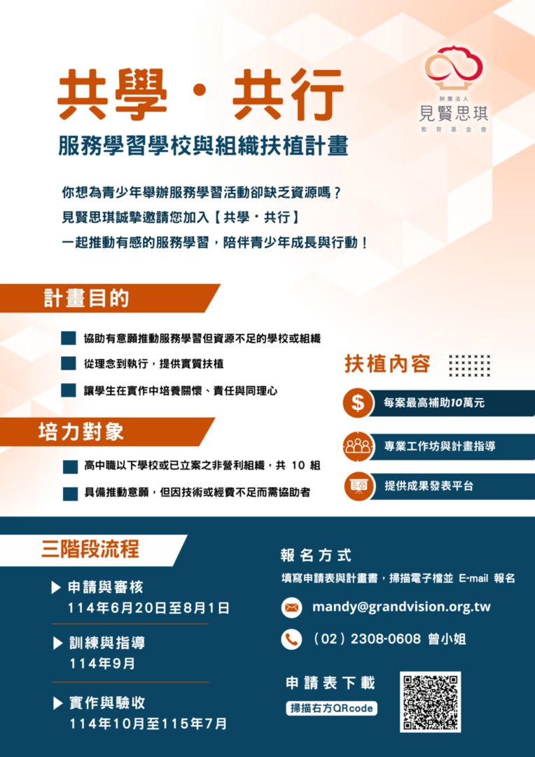 旨:檢送本會辦理【共學・共行】服務學習學校與組織扶植計畫書,為推廣本會服務學習理念,深化組織及學校對服務學習推動執行的能力,並深化青少年對服務學習的認識,敬請各校踴躍申請,請查照。