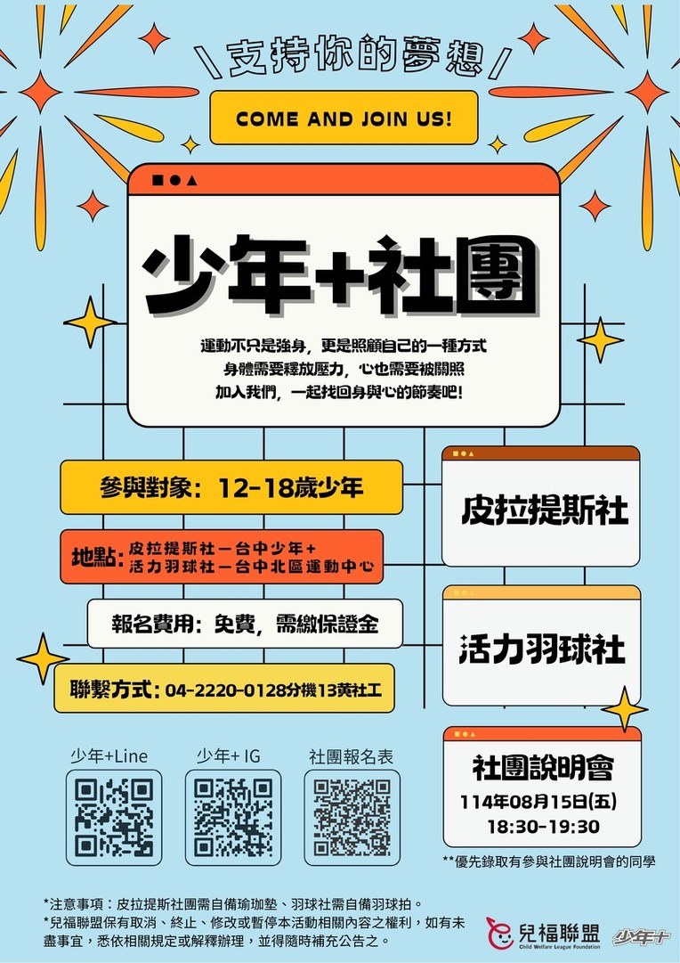 (一)社團說明會時間:114/8/15(五) 18:30-19:30,為使少年更清楚社團規範及運作,優先錄取能參與社團說明會者。