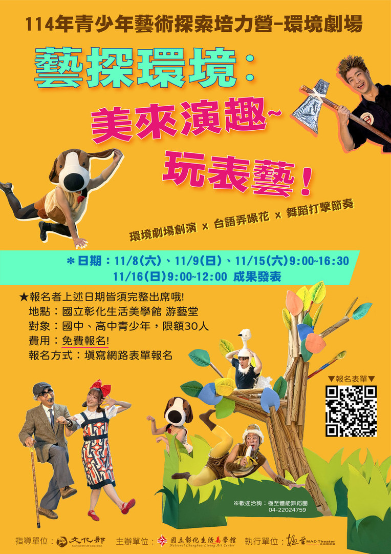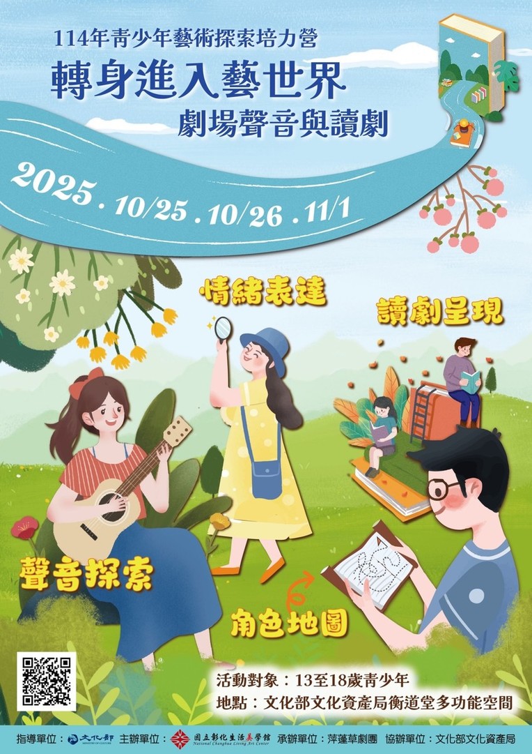 一、本活動以「劇場聲音與讀劇」及「環境劇場」為主題,結合基礎性、專業性與跨領域的表演藝術活動內容,由藝文團隊帶領青少年進行表演藝術體驗,提供青少年藝文學習資源,培養青少年藝文欣賞與創作能力。