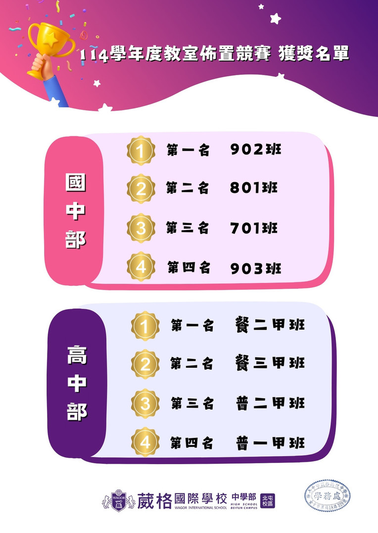感謝各班師生的用心與努力,在教室展現了創意與巧思,營造出充滿活力的學習環境。 本次競賽結果如下,獲獎班級將擇期於週會中公開頒獎,以資鼓勵。