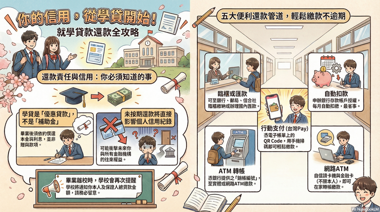 三、依「高級中等以上學校學生就學貸款辦法」規定,學校應 於學生在校時持續宣導償還貸款之重要性,並告知就學貸 款係政府優惠貸款,非屬補助或贈與款項,仍須依約償還 本息,並於學生畢業離校時通知學生本人及其保證人曾貸 款之金額,明確告知若未能按期還款,將直接影響其信用 紀錄及日後與其他金融機構往來之權益。
