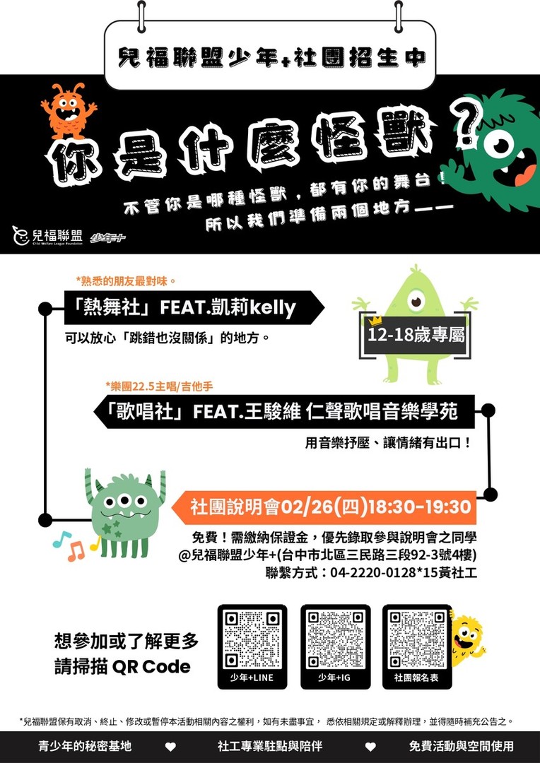 主旨:有關本會「少年+」據點辦理「熱舞社」、「歌唱社」社團事宜,敬請貴校協助公告,不勝感恩。