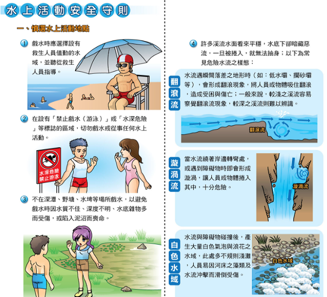 一、請學生於假期從事水域活動時,應留意「選擇安全水域戲水」,不要靠近危險區域,切勿至河流溪邊等未有救生員之水域進行活動,且學生應有家長陪同,避免單獨出遊,並籲請家長留意子女假日行蹤。