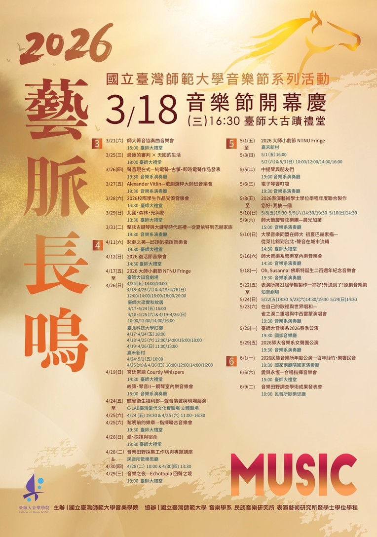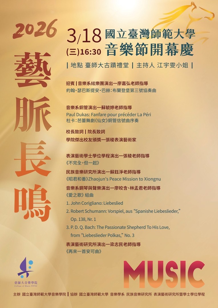 一、本校音樂學院暨系所於本(115)年3月18日16:30假本校禮堂舉辦「2026師大音樂節開幕慶」;3月21日起至6月9日舉辦「2026師大音樂節系列活動」共31項78場次展演,假國家音樂廳及本校禮堂、音樂系演奏廳、知音劇場等展演場地舉辦,大部分活動為免費自由入場,歡迎蒞臨欣賞並請協助宣傳。