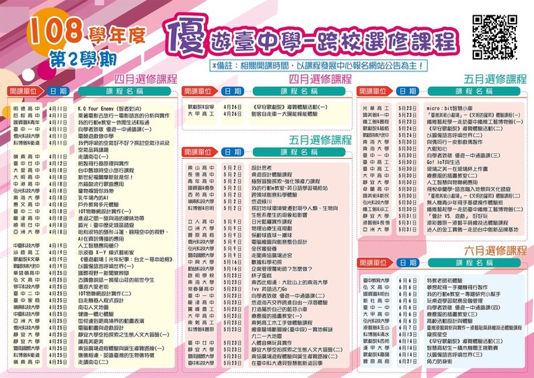 一、為讓學生及早體驗新課綱課程,協助學生打造自主學習計畫、完備學習歷程,本局整合社教館院、大學、高級中等學校等單位開設跨校選修課程,提供中彰投苗4縣市的國3至高3學生選修。
